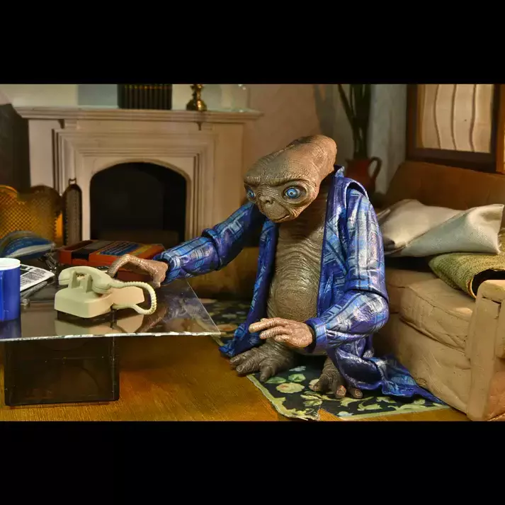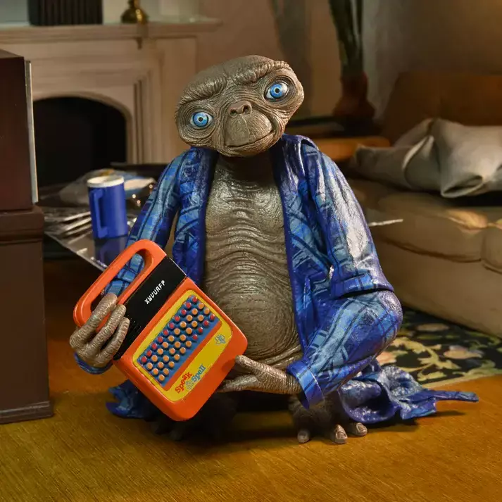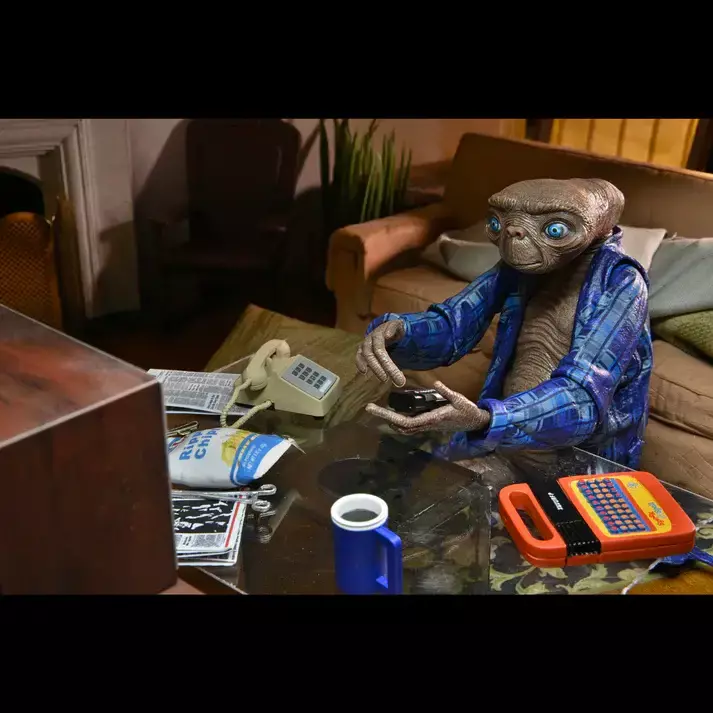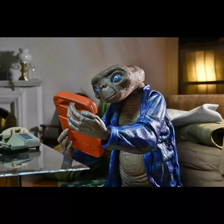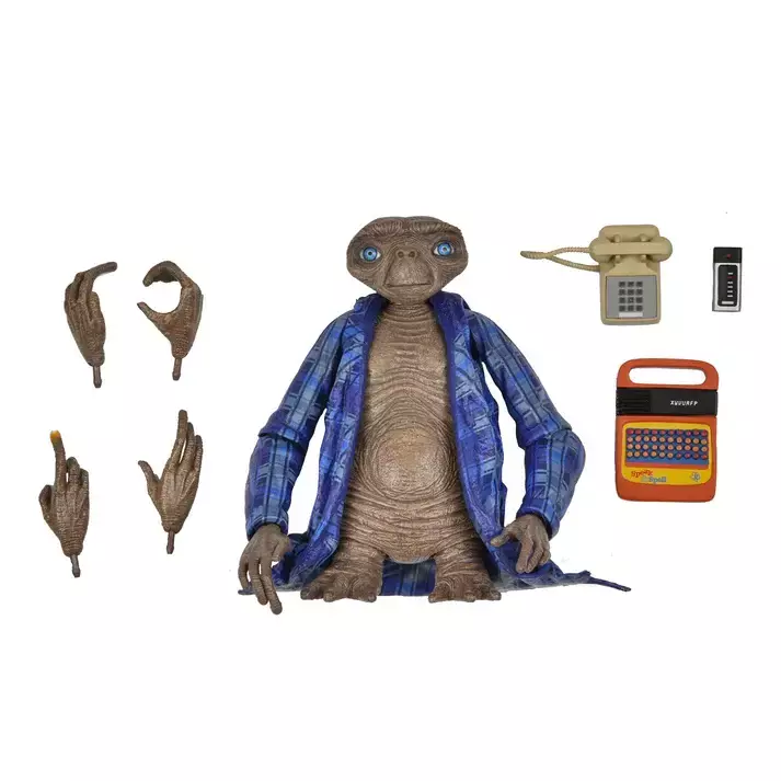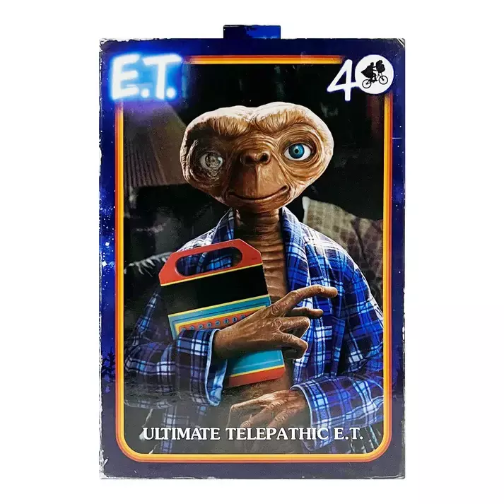 ¡Esta figura de acción Ultimate celebra el 40 aniversario del clásico! Trae la magia y la emoción de E.T., el extraterrestre, a tu mundo. A medida que crezca tu amistad con E.T., revive todos sus encuentros en la Tierra o mira a las estrellas y crea tus propias aventuras interactivas inolvidables. El E.T. telepático Ultimate presenta detalles increíblemente realistas y luce la bata azul a cuadros de las escenas en casa. E.T. mide 18 cm (aproximadamente 11 cm de alto) y es articulado. Incluye Speak & Spell, teléfono y control remoto de TV, además de cuellos y manos intercambiables. Viene en una caja con ventana, ideal para exhibir, conmemorativa del 40 aniversario y con solapa frontal abatible.